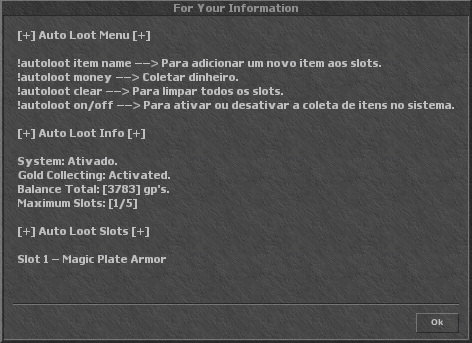Primeiramente ligue o sistema, utilizando o seguinte comando: !autoloot on